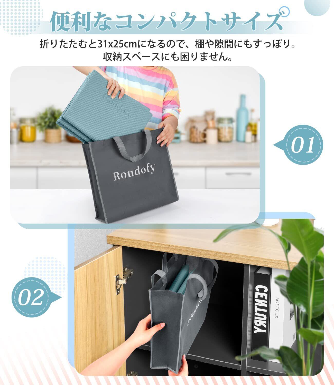【持ち運びが便利】人気フィットネスブランドRondofyのヨガマットが登場!ロール状のトレーニングマットなら持ち運ぶのは簡単ではなく、大変です。そんな悩みを解決してくれるのは、折りたたみ式ヨガマット。長さ31センチまで折り畳めるコンパクトサイズで、片手で持てる折りたたみ式になっています。専用バッグも付いているので、自転車のカゴに簡単に入れられ、ジムやヨガのレッスンに持ち運ぶのにすごく便利!ヨガやストレッチフィットネスやトレニングに最適です。