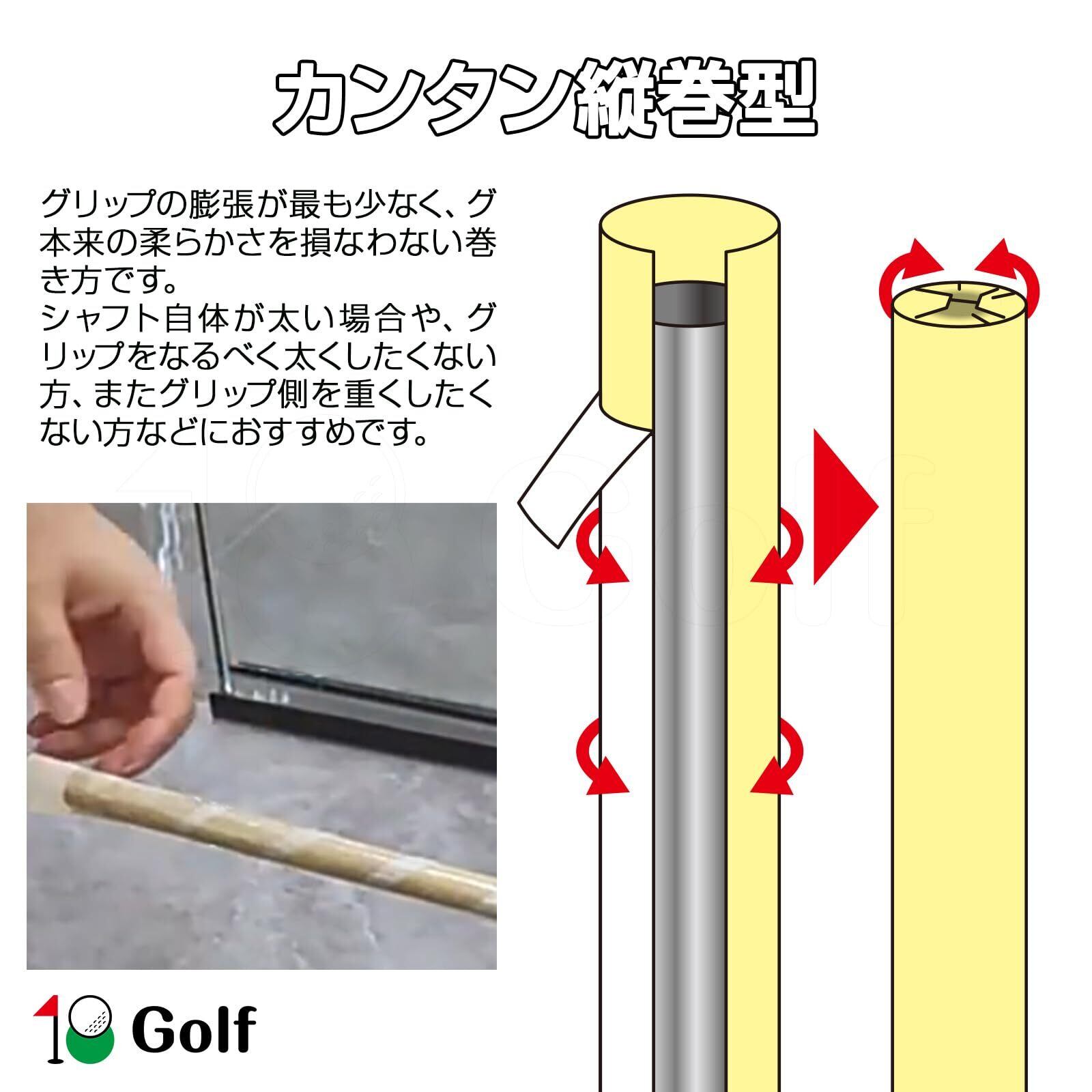 【縦巻き仕様】 幅5cmのテープは縦巻きに最適なサイズ。縦巻きはグリップの膨張を最小限に抑え、ゴルフグリップ本来の柔らかさをキープするのが特長です。
