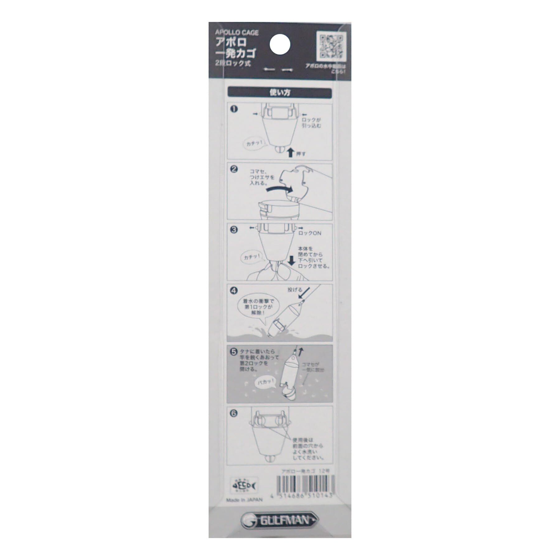 新製品「アポロ一発カゴ」は、2段ロック式で、ロック機構をコマセカゴにすべて内蔵させました。外周にロック機構を出さないことにより、糸がらみ、衝突による変形を防ぐ、遠投性に優れた形状を形成できる、画期的な一発カゴです。カゴの大きさは、“アポロカゴ"と同程度寸法です。海面に当たると作動する第1ロック機構! シャクると開く第2ロック機構!