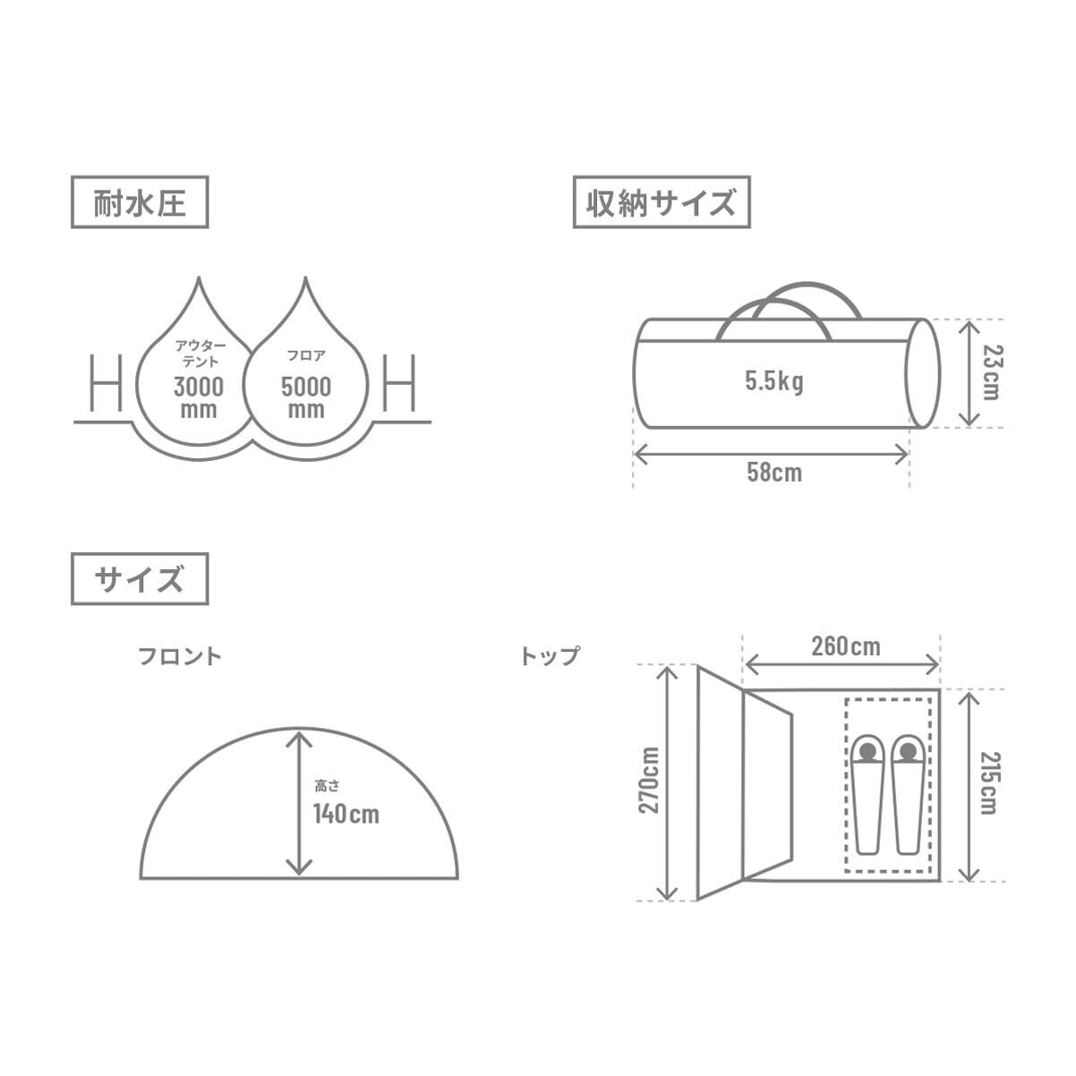 耐水圧:アウターテント:3,000mm フロア:5,000mm