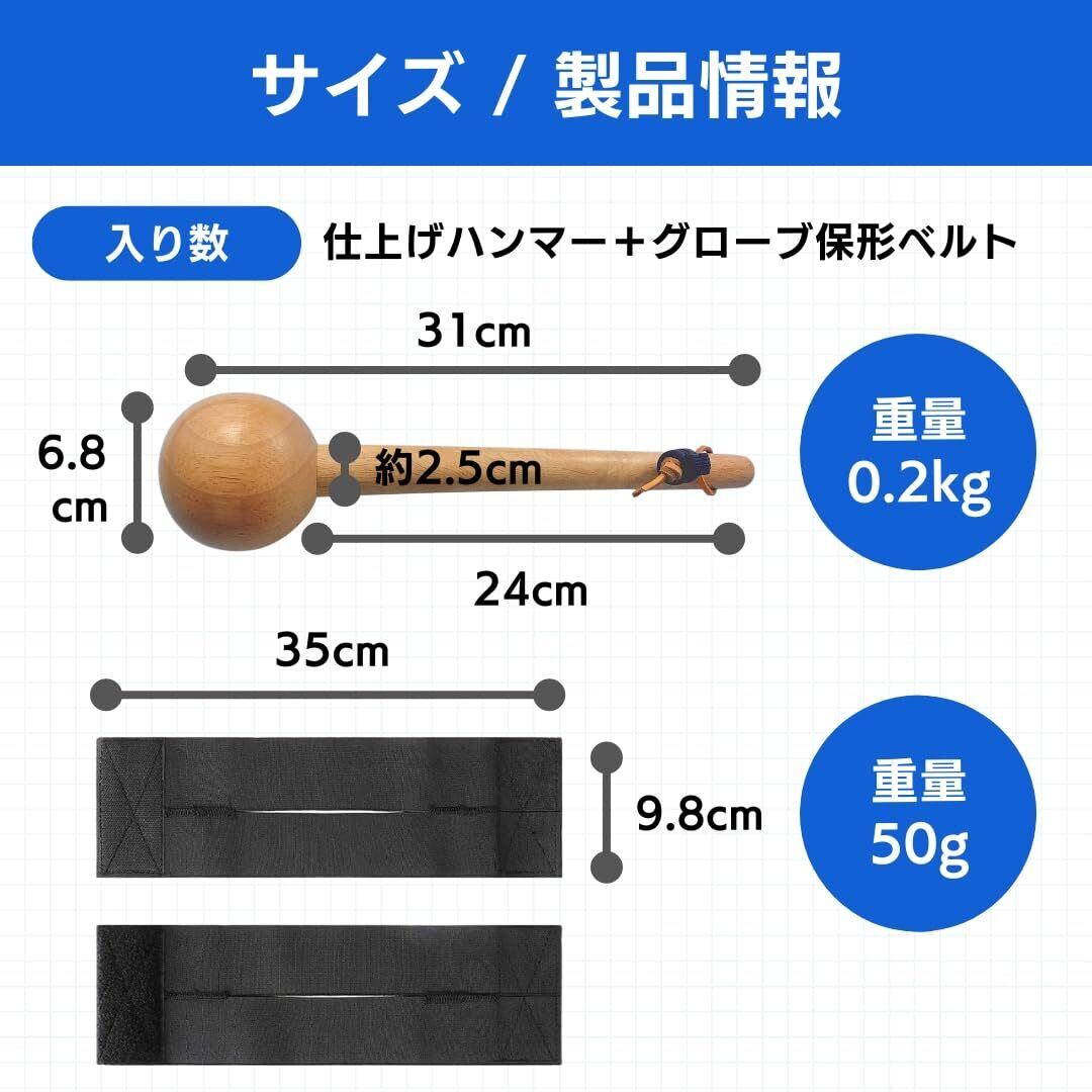 【サイズ・スペック】「サイズ」ハンマー:縦=31cm×横=6.8cm 柄:縦=24cm 横=約2.5cm重量:0.2kgベルト:縦=35cm 横=9.8cm「入り数」仕上げハンマー+グローブ保形ベルト