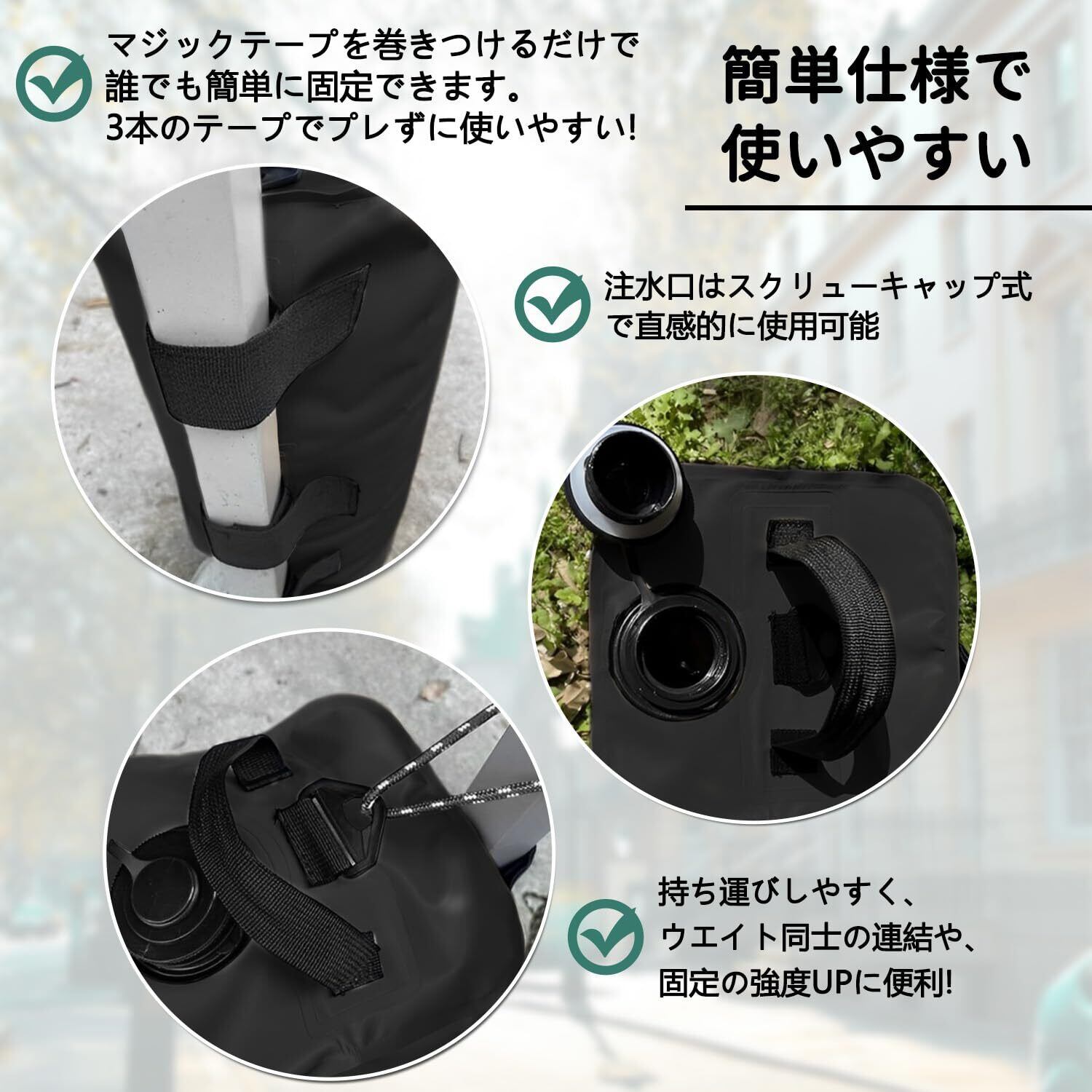 ✿【キャンプやビーチ、看板にも! ペグが使用できない時に大活躍】 ペグが使えない場所でもタープテントを固定できます。水を入れるだけで使える便利な注水タイプです。地面がアスファルトでペグが打てない時や、ペグが抜けやすいビーチや川辺などにオススメです。