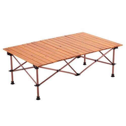 天板に天然木を使用したナチュラルな風合いの2ステージテーブル。ロール天板と収束型フレームでコンパクト収納。高さ2段階調整可能(約30cm・70cm)。