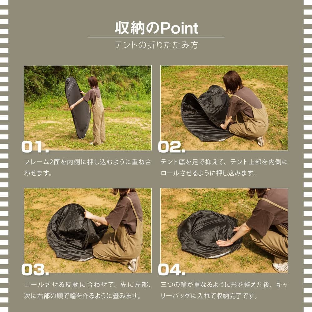 【ポップアップ式/着替えテント】キャンプ、ビーチ、イベント、防災用など着替えスペースを確保するポップアップテント。自動的に広がり、わずか20秒ほどで完成します。フロントシート(扉)を閉じればフルクローズ、プライバシー保護が図れます。高さ190㎝仕様。広さは約1㎡で簡易トイレの設置も可能。防災時のトイレは必要不可欠。普段から備えておくと安心です。
