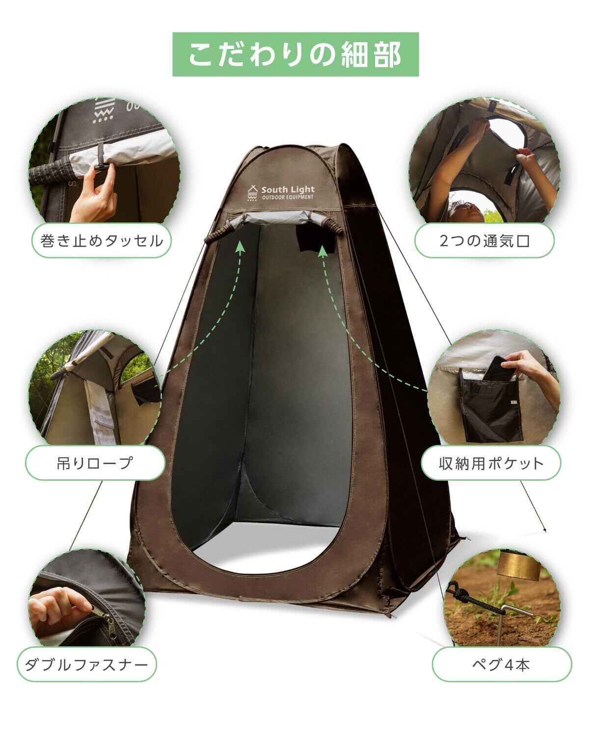 【幅広い用途&製品仕様】本製品は更衣室としてだけでなく、简易トイレやビーチテントのシャワー室としても幅広く活用できます。 型番:sl-lyzp01 色:ブラウン 材質:ポリエステル(シート、ロープ)、スチール(フレーム、ペグ) サイズ:組立時 約W120×D120×H190㎝ 同梱品:テント本体×1、ペグ×4、ロープ×4、収納バッグ(ポリエステル製)×1