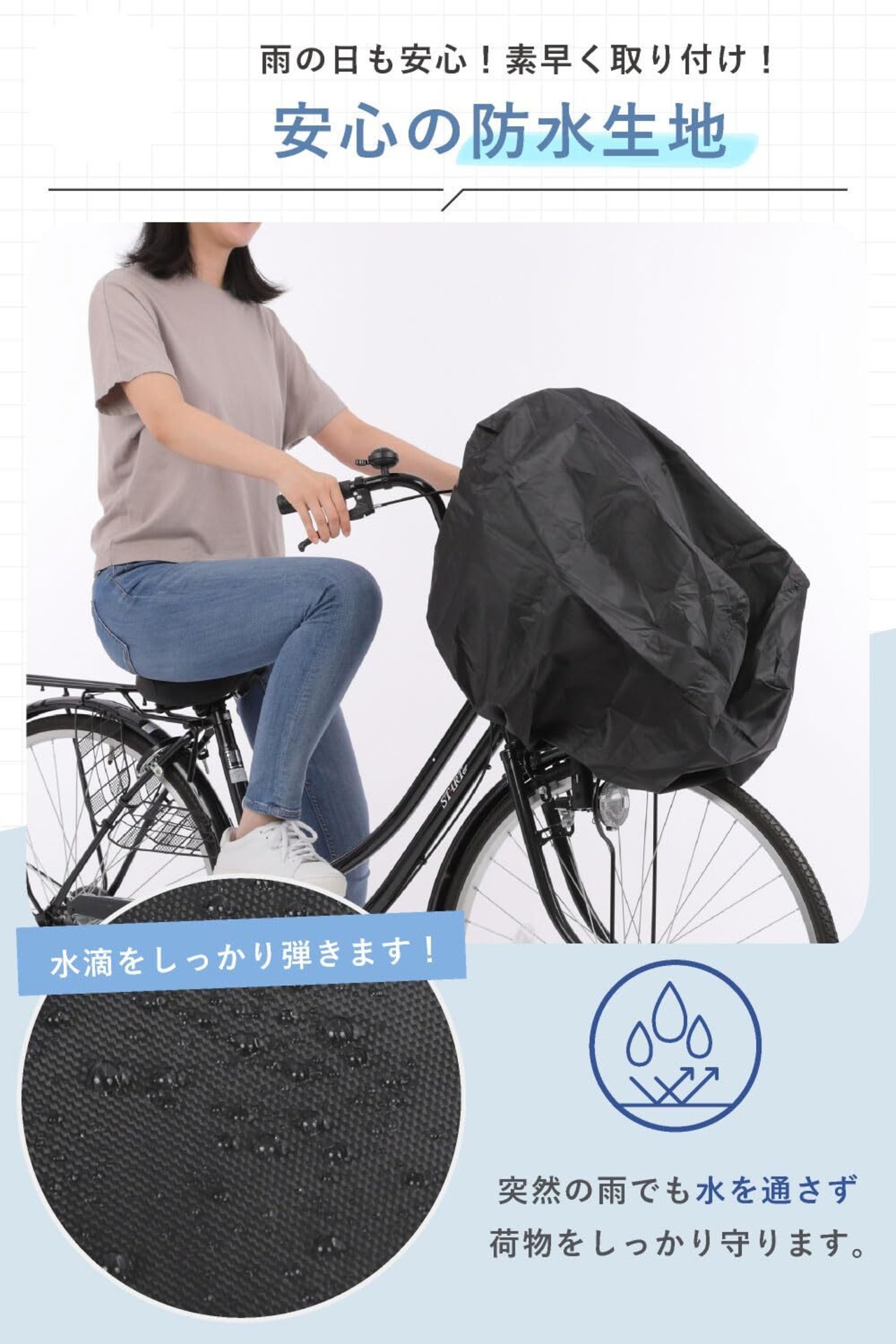 前後のカゴに使用可能 後ろ の カゴ にも前カゴにも使用可能なサイズとなっております。前カゴ に入れるバッグ等が小さい場合は布地が余りますので カゴ の隙間などに余った布地を入れてご使用ください。