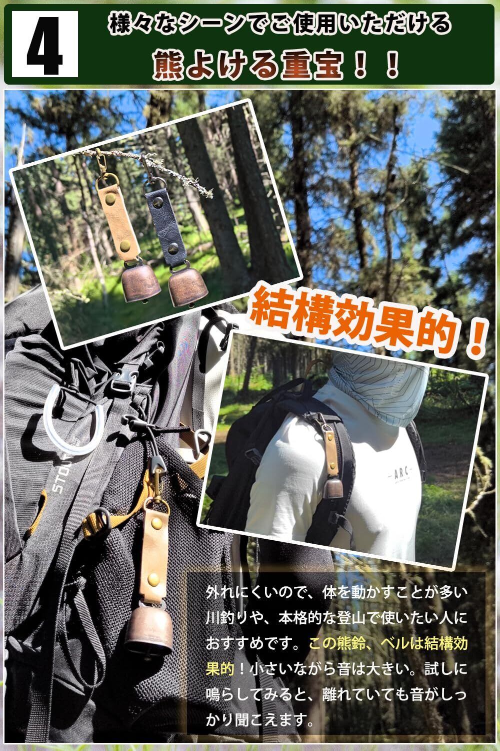 【熊よけベル】熊よけ鈴を鳴らしながら移動して、熊側に予めこちらの存在を認識させることが大切だとされています熊の恐怖から逃れるならばシンプルなものです。この熊鈴、ベルは結構効果的!小さいながら音は大きい。試しに鳴らしてみると、離れていても音がしっかり聞こえます。