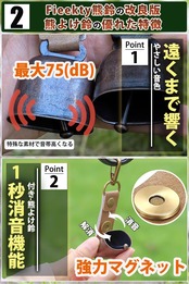 【消音機能付き】使用しない時のために逆さにしてストラップ中間部にあるマグネットにつけると消音するのも良いです。とてもコンパクトでシンプルな構造なうえ、消音がベルを持ち上げてストラップ部分のマグネットにくっつけるだけという、とても簡単で使いやすいからです。
