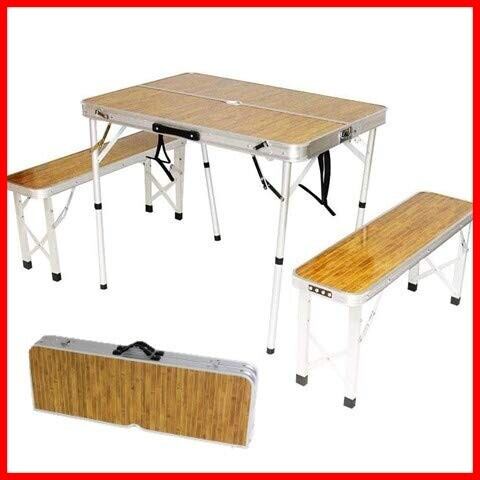 【テーブルとベンチがセットになった木目調の二つ折りアルミ製アウトドアテーブル】お庭やテラスの簡易テーブルから、ピクニック・アウトドア・キャンプ・BBQ・レジャー・運動会・イベントなど、持ち運びも組立も簡単でお勧めです。パラソルを立てられるアジャスター付きで日中の日差し対策にも安心仕様!
