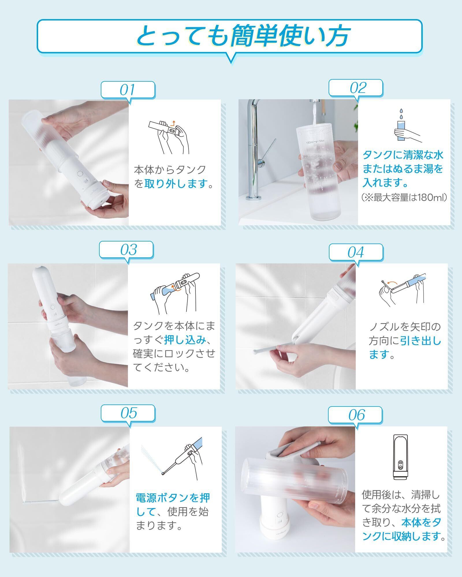 簡単操作と充実の付属品: Keynice携帯洗浄器は180°調整可能なノズルを搭載し、用途や姿勢に合わせて最適な角度で使用できます。操作はシンプルで直感的、分かりやすい取扱説明書も付属しております。パッケージには携帯洗浄器本体、USBケーブル1個、予備ノズル1個、専用袋、クリーニングクロスが全て含まれています。
