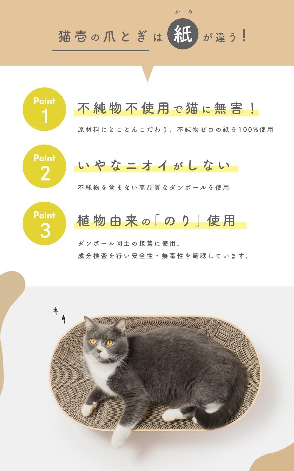 【大人気バリバリボウルが”横長”に】からだフィット形状のつめとぎベッドとして、猫から大人気のバリバリボウルの “オーバル”タイプです。つめとぎベッドはレギュラーサイズ比、約1.5倍でたっぷりつめとぎを楽しめます。