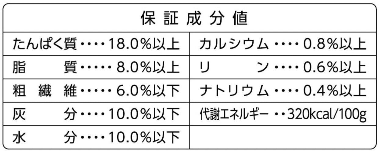 穀類(とうもろこし、コーングルテンフィード、小麦ふすま、米糠、コーングルテンミール)、豆類(脱脂大豆、乾燥おから等)、肉類(ミートミール、チキンエキス)、動物性油脂、すき焼エキス、アルファルファミール、セルロース粉末、植物発酵抽出エキス、ミネラル類(カルシウム、塩化ナトリウム、鉄、亜鉛、銅、ヨウ素)、ビタミン類(A、D、E、B2、B12、パントテン酸、コリン)