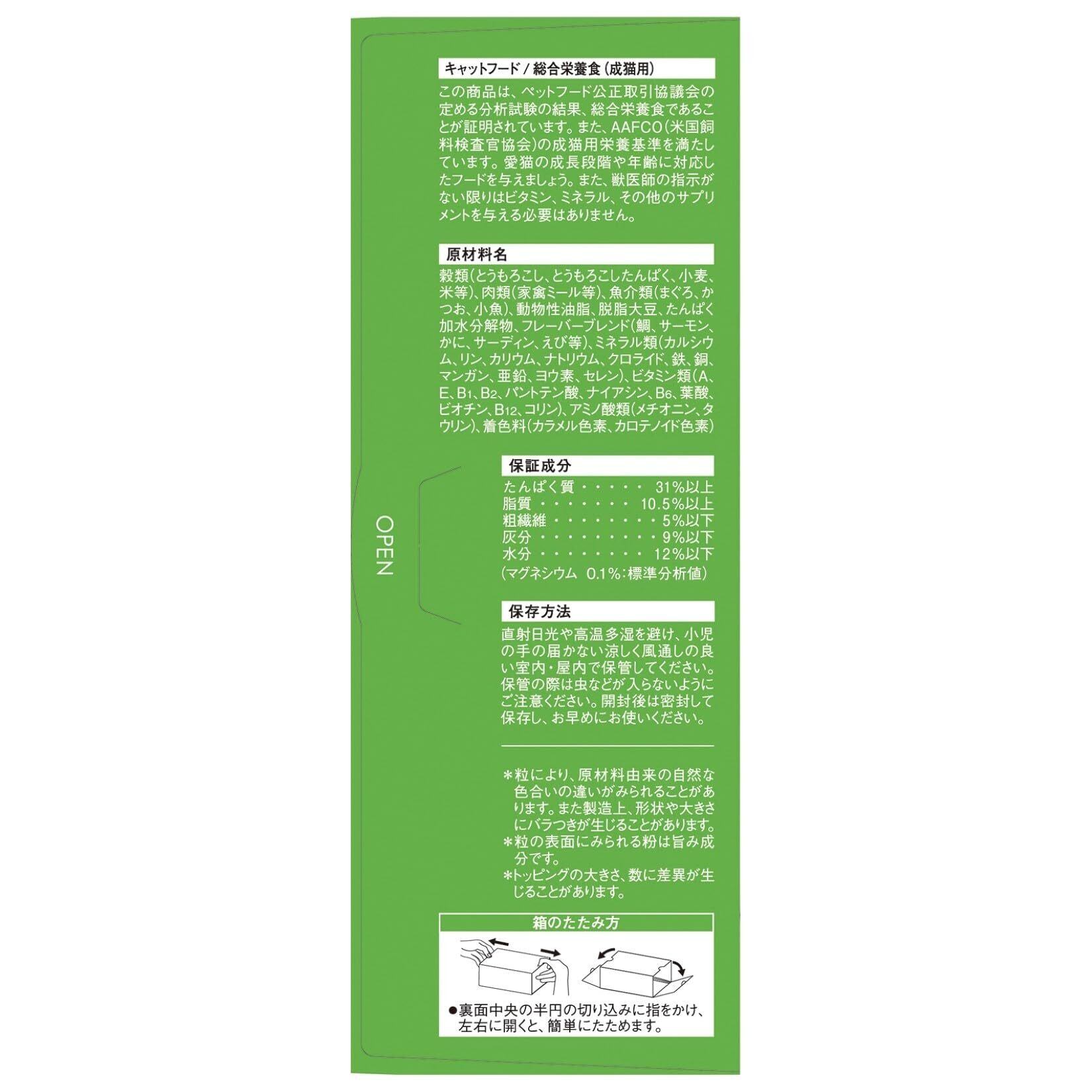 原材料:穀類(とうもろこし、とうもろこしたんぱく、小麦、米等)、肉類(家禽ミール等)、魚介類(まぐろ、かつお、小魚)、動物性油脂、脱脂大豆、たんぱく加水分解物、フレーバーブレンド(鯛、サーモン、かに、サーディン、えび等)、ミネラル類(カルシウム、リン、カリウム、ナトリウム、クロライド、鉄、銅、マンガン、亜鉛、ヨウ素、セレン)、ビタミン類(A、E、B1、B2、パントテン酸、ナイアシン、B6、葉酸、ビオチン、B12、コリン)、アミノ酸類(メチオニン、タウリン)、着色料(カラメル色素、カロテノイド色素)