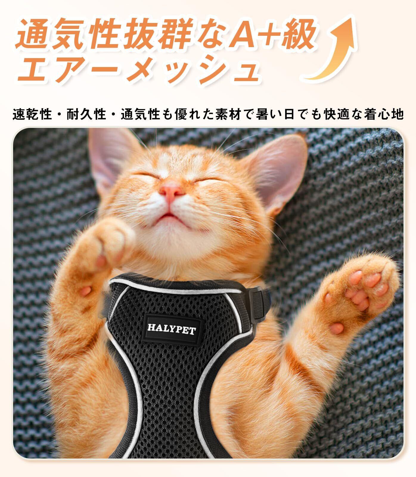 {耐久性と夜間の安全性を兼ね備えた}➡{使用安心}薄暗い場所や夜間の使用中視認しやすいように、首元と胴回りにはくっきりと発光する反射素材を使っており、夜間の散歩中に車や自転車のライトを反射 し、ペットの視認性を高めて安全を確保できます。夜になっても猫ちゃんとより安全に楽しくお散歩できます!繋げる部分にあるDカンとナスカンの留め具は耐衝撃性に優れた亜鉛合金製なので、高い引張強度があり、丈夫で錆も強いで安心してお使い頂けます。付属の猫リードと合わせて使用することで、より効果的なコントロールが可能となり、迷子の防止にも役立ちます。普段の散歩 、 外出 、災害時の避難用としても大活躍します。