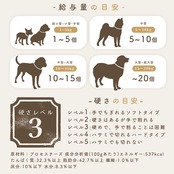 ●給与量 1日に必要なエネルギー量の20%以下となるよう下記の給与量を目安に2~3回に分けて与えてください. 体重:与える量 ・~ 5kg:~8g ・~10kg:16g ・~20kg:~35g ・20kg~:~50g ※おやつは嗜好品です。フードの量に合わせて与える量を調整してください。 ●成文分析値(100gあたり) たんぱく質:32.3%以上 脂肪分:42.7%以上 繊維:1.0%以下 灰分:10%以下 水分:8.3%以下 エネルギー:537kcal