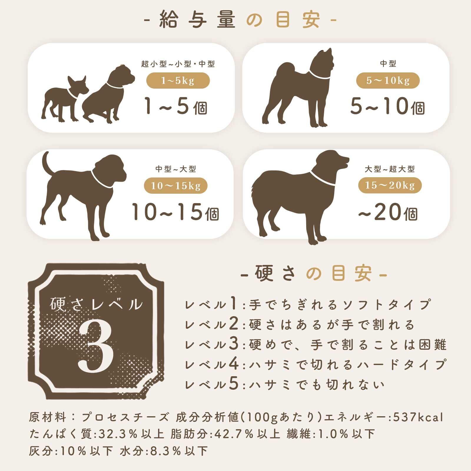 ●給与量 1日に必要なエネルギー量の20%以下となるよう下記の給与量を目安に2~3回に分けて与えてください. 体重:与える量 ・~ 5kg:~8g ・~10kg:16g ・~20kg:~35g ・20kg~:~50g ※おやつは嗜好品です。フードの量に合わせて与える量を調整してください。 ●成文分析値(100gあたり) たんぱく質:32.3%以上 脂肪分:42.7%以上 繊維:1.0%以下 灰分:10%以下 水分:8.3%以下 エネルギー:537kcal 持ち運びしやすい、少し固め約0.8cmサイズの小粒キューブタイプ! お散歩中のご褒美にもぴったりです。チーズの効果 ・エネルギー供給に最適 ・皮膚や被毛、筋肉の維持 ・タンパク質や炭水化物よりも効率よくエネルギーの供給が出来る ・食いつきが良くなる、集中力向上 チーズは香りが強く、鼻のいいワンちゃんにとってはとても魅力の強い食べ物です。 暑い時期や食欲の落ちがちなシニア犬のトッピングに最適。
