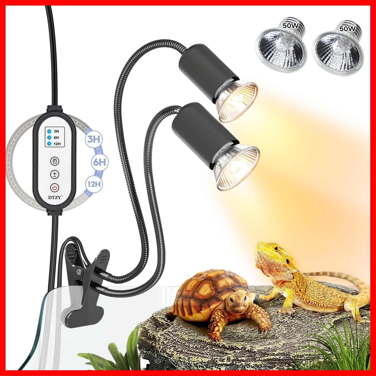 DTZY二頭爬虫類 ライト 亀 バスキング ライト兼用 50W*2保温電球 アナログ太陽 UVA&UVBランプ 24時間サイクルタイマー機能 明るさ調節可能 360度回転可能 爬虫類&両生類適用