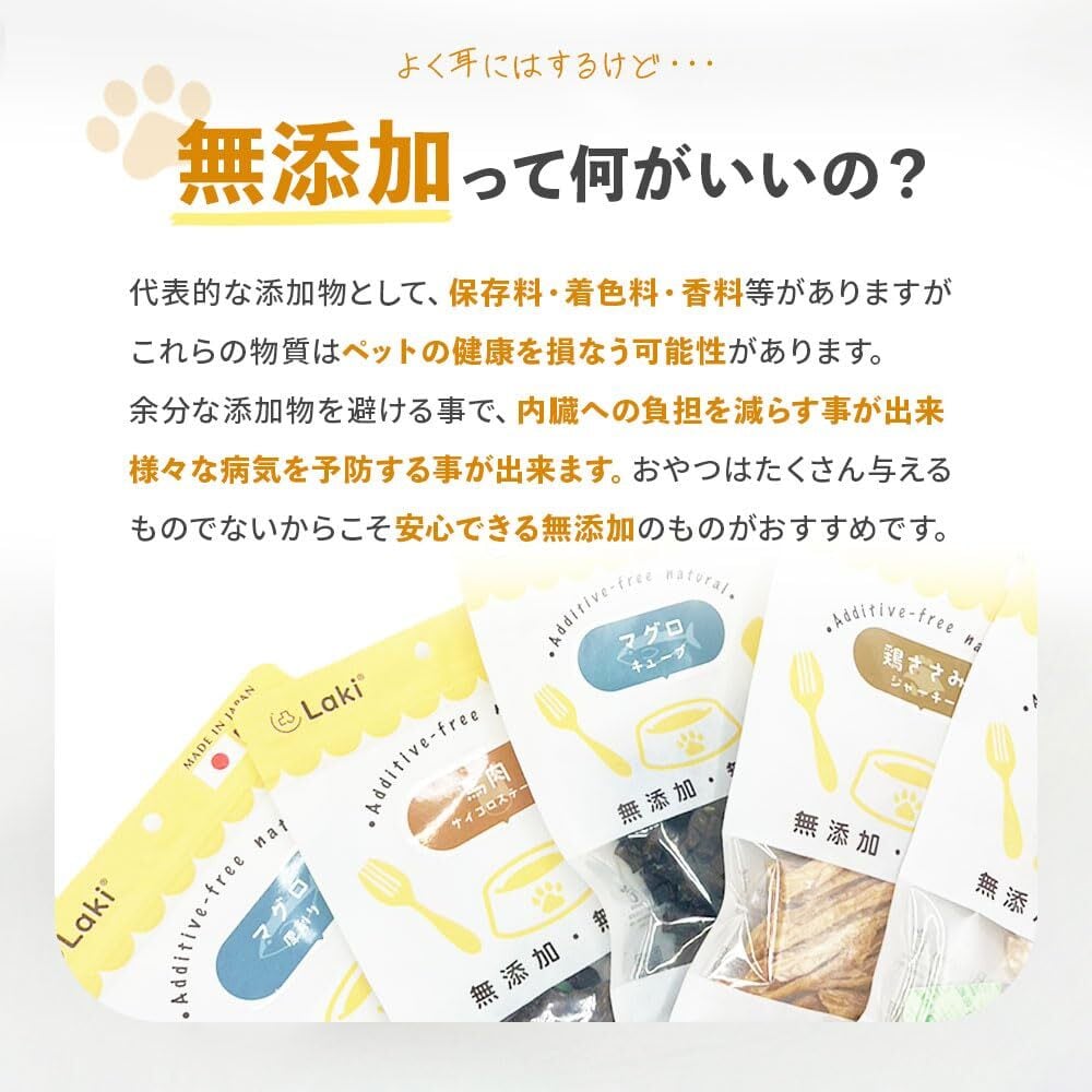 完全無添加・国産・無着色・国内製造ペットの身体の事だけを考え、原料のみを使用した100%無添加です。ヒトも口にする"ヒューマングレード"の国産素材のみを使用し、パッキングも日本国内で行っております。