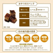 給与量 1日に必要なエネルギー量の20%以下となるよう下記の給与量を目安に2~3回に分けて与えてください。 体重:与える量 ・~ 5kg:~13g ・~10kg:~22g ・~20kg:~37g ・20kg~:~50g ※おやつは嗜好品です。フードの量に合わせて与える量を調整してください。