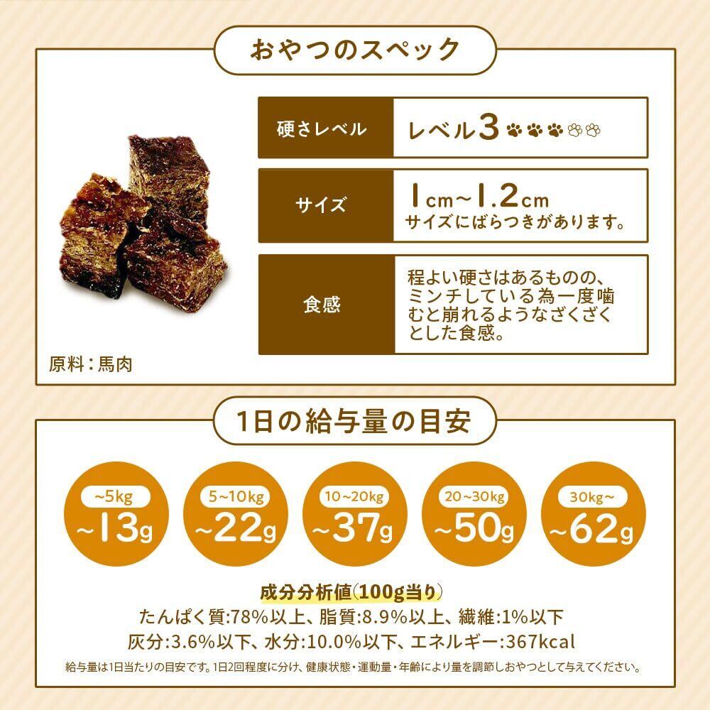 一度ミンチを行ったザクほろ食感のキューブ国産の馬肉を新鮮なままミンチを行い、つなぎ等は一切使用せずに食べやすく持ち運びしやすいキューブタイプに成形しました。ざくざくとした食感で他のキューブよりも食べやすい硬さに仕上っています。