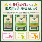 成犬時の体重1kg:2ヶ月齢~1本、4ヶ月齢~2本、成犬時の体重2kg:2ヶ月齢~2本、4ヶ月齢~3本、成犬時の体重3kg:2ヶ月齢~3本、4ヶ月齢~5本、成犬時の体重5kg:2ヶ月齢~5本、4ヶ月齢~7本、成犬時の体重7kg:2ヶ月齢~7本、4ヶ月齢~10本、成犬時の体重10kg:2ヶ月齢~9本、4ヶ月齢~13本 主食の量は適宜調節し、常に新鮮な水をご用意ください。のどに詰まらせないように必ず観察し見守りながら与えてください。グリニーズを手に持って、よく噛ませてください。