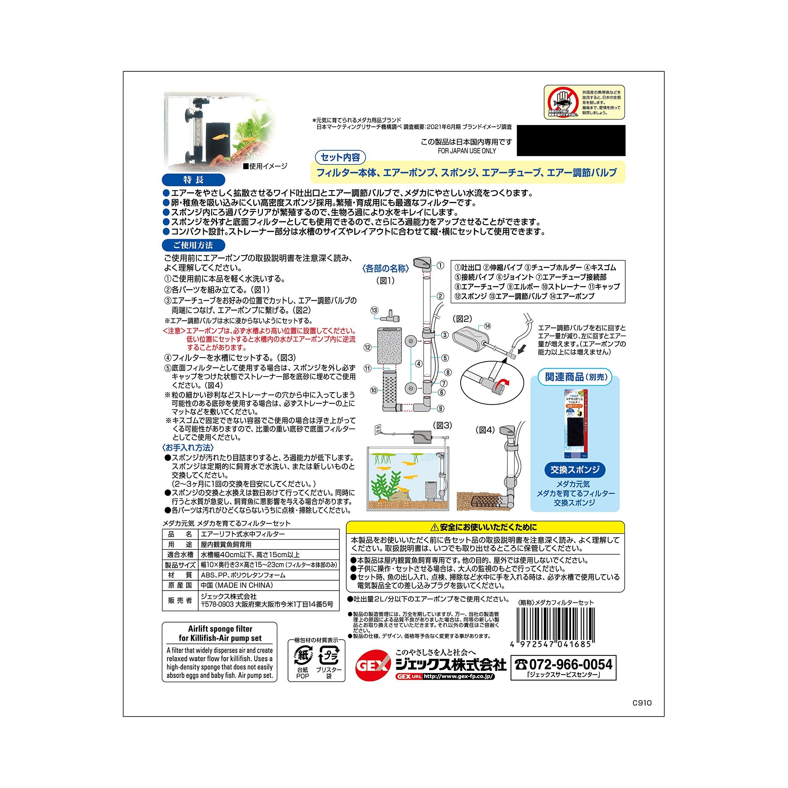 ジェックス GEX メダカ元気 メダカを育てるフィルターセット エアーポンプ付き メダカ用スポンジフィルター 40cm以下水槽用 メダカ