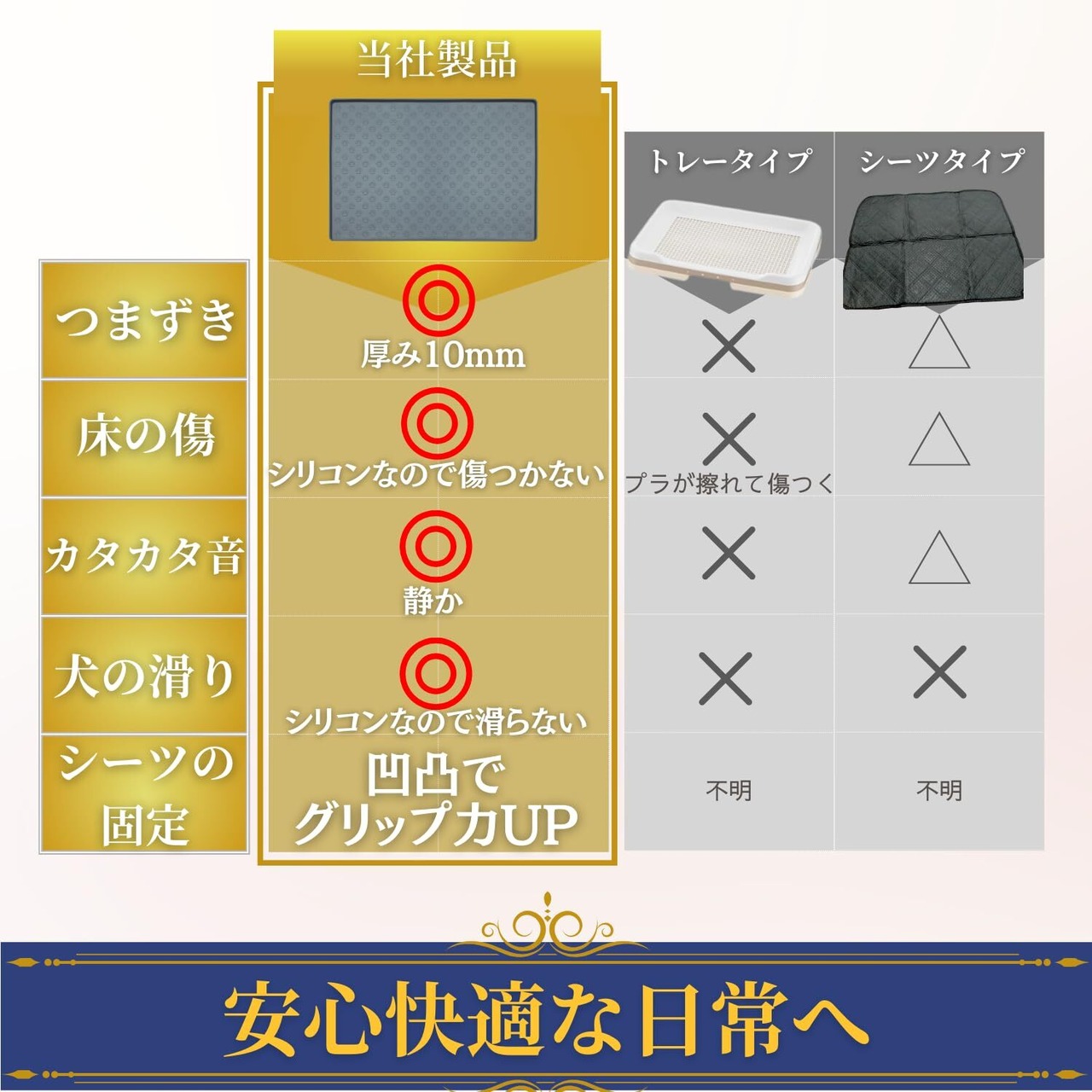 滑らない加工: 密着力が強いシリコンマットは排便パッドを乗せても散らばる心配が無く便利です。