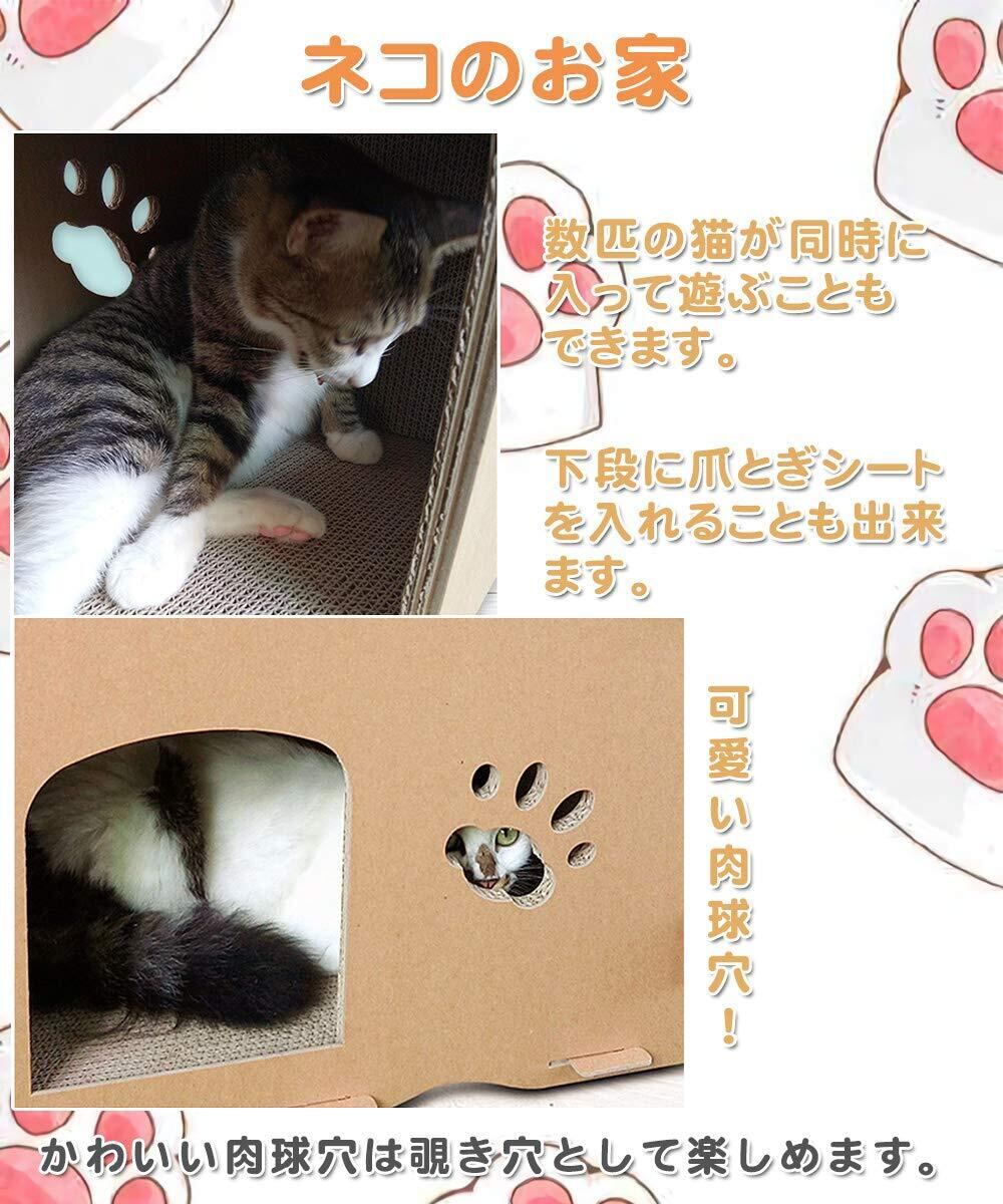 【可愛い肉球穴】出入り口以外にも肉球型の可愛い小窓が付いていますので、ここからおもちゃを出し入れして猫ちゃんと遊んでも楽しいでしょう。中は広々なので、数匹の猫が同時に入って遊ぶこともできます。ハウスの中で爪を研ぐ姿は見てても癒されます。