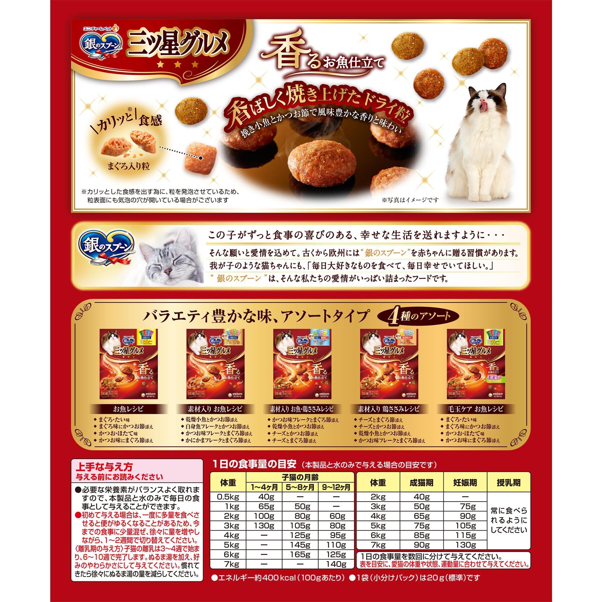 穀類(トウモロコシ、小麦粉、パン粉、コーングルテンミール)、肉類(ビーフミール、チキンミール、ポークボーンミール、チキンエキス等)、動物性油脂、魚介類(フィッシュエキス、煮干パウダー、鰹節、マグロミール、白身魚ミール、乾燥シラス等)、卵類(卵パウダー)、酵母エキス、ミネラル類(カルシウム、塩素、コバルト、銅、鉄、ヨウ素、カリウム、マンガン、リン、亜鉛)、調味料、ビタミン類(A、B1、B2、B6、B12、C、D、E、K、コリン、ナイアシン、パントテン酸、ビオチン、葉酸)、着色料(二酸化チタン、赤色102号、赤色106号、黄色4号、黄色5号)、アミノ酸類(タウリン)、酸化防止剤(ミックストコフェロール、ハーブエキス)