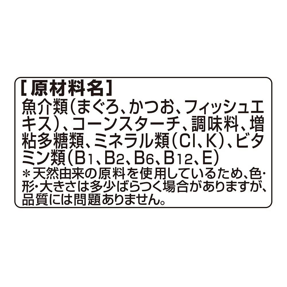 魚介類(まぐろ、かつお、フィッシュエキス)、コーンスターチ、調味料、増粘多糖類、ミネラル類(Cl、K)、ビタミン類(B1、B2、B6、B12、E)※天然由来の原料を使用しているため、色・形・大きさは多少ばらつく場合がありますが、品質には問題ありません。