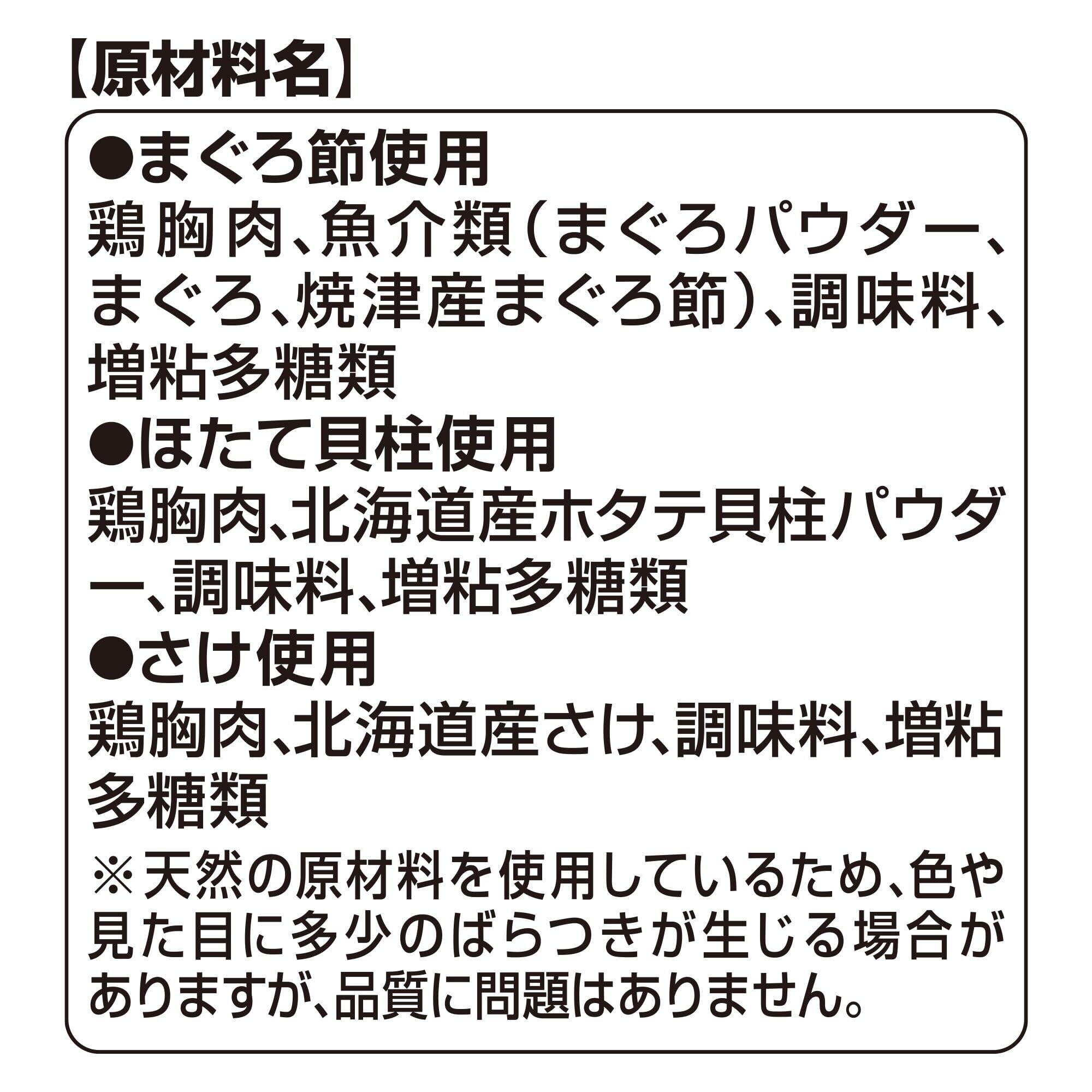 【原材料(成分)】 【まぐろ節使用】 鶏胸肉、魚介類(まぐろパウダー、まぐろ、焼津産まぐろ節)、調味料、増粘多糖類 【ほたて貝柱使用】 鶏胸肉、北海道産ホタテ貝柱パウダー、調味料、増粘多糖類 【さけ使用】 鶏胸肉、北海道産さけ、調味料、増粘多糖類 【成分】 【3種共通】 タンパク質6.0%以上、脂質0.5%以上、粗繊維1.0%以下、粗灰分3.0%以下、水分95.0%以下 【エネルギー】 【3種共通】 約3kcal/1本