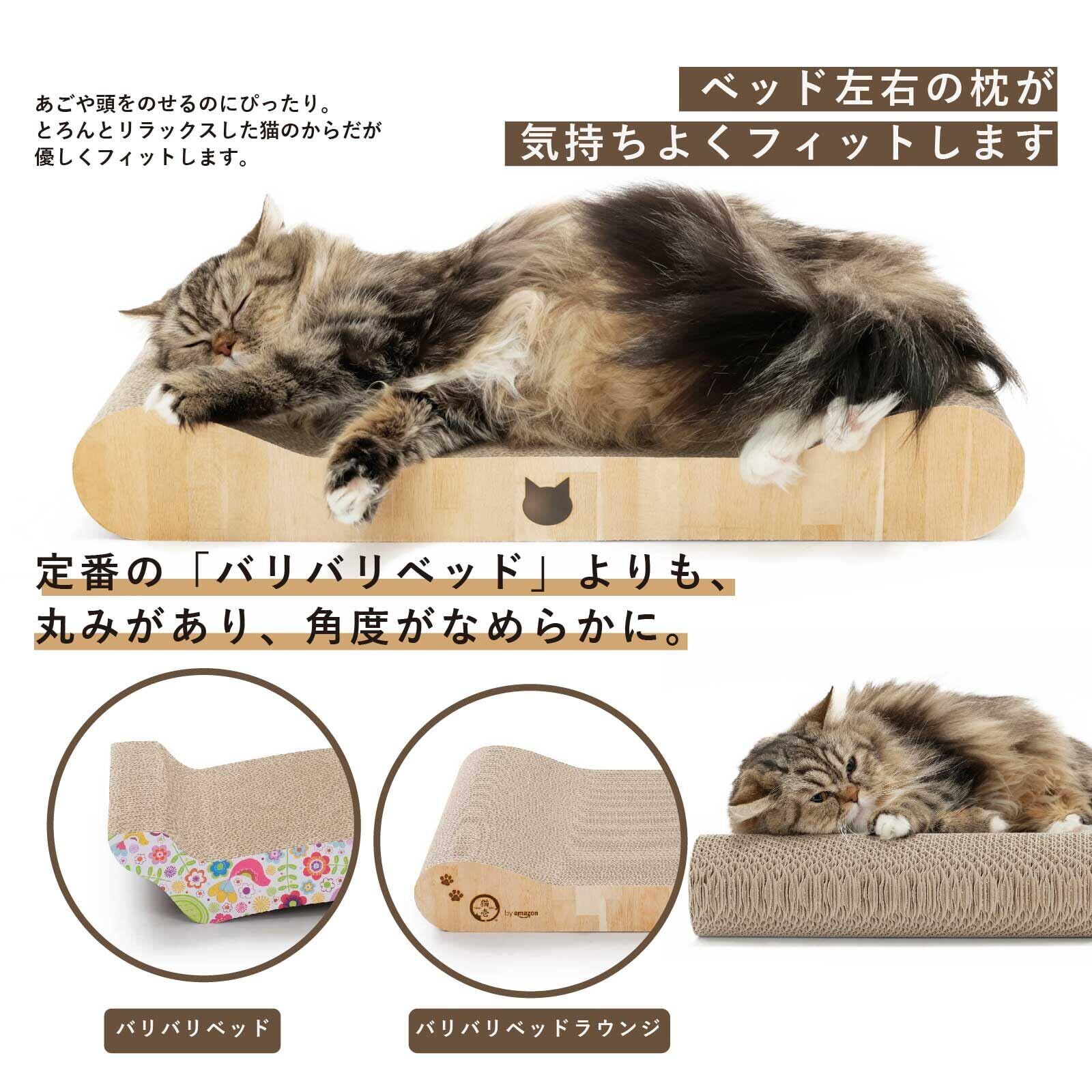 【6kg越えの大きめ猫ちゃんも広々ゆったりサイズ】バリバリベッドラウンジは、奥行55cm幅32cmの猫壱のバリバリベッドシリーズの中でも最大サイズ。 くるんと丸くなって寝るよりも、身体をのびのび伸ばして寝たい猫やへそ天寝が好きな猫にぴったりの形です。 カラーはライトブラウンとダークブラウンの2種類。インテリアや猫の毛色に合わせてお好きなカラーをお選びいただけます。 【ベッドの左右についた枕が気持ちいい】バリバリベッドラウンジの左右は、猫が顎を乗せたり、頭を乗せたりするのにぴったりな枕付き。 定番バリバリベッドの左右と比較すると角が丸く、角度がよりなめらかになっています。リラックスしてとろんとした猫のやわらかな体が優しくフィットします。 【植物由来の糊使用】猫がつめとぎをした後、手や肉球をなめても心配がないよう、ダンボールを貼り合わせる際に使用している糊は、とうもろこしを主原料とした植物由来の糊を使用しています。 【有害物質ゼロ!こだわり抜いた原材料】つめとぎ部分に使用しているダンボールは、原料の100%が紙です。内10%はニュージーランド産原パルプ紙を使用。 大切な猫に使用するつめとぎなので、品質にはとことんこだわりました。高品質なので嫌なニオイが少なく、とぎカスもでづらくなっています。 【高密度ダンボールで長持ち】ダンボールは薄いダンボールを貼り合わせています。薄いタイプを使用することで密度が高くなり、猫のとぎ甲斐アップだけでなく、耐久性も持たせています。