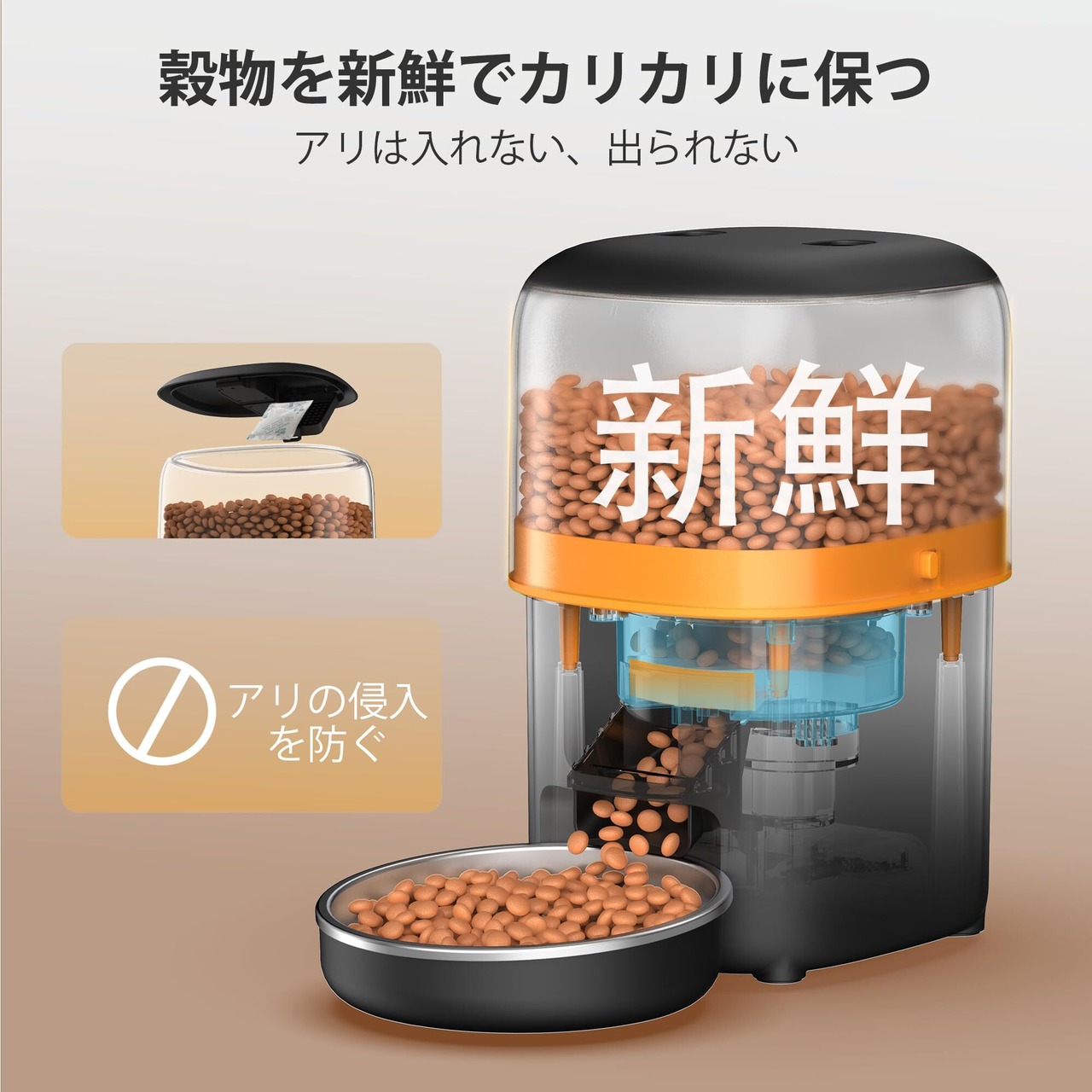 【多重密閉構造でフードはいつも新鮮】猫用自動給餌器の上蓋は、強化シールと乾燥剤を使用して設計され、フードを長時間新鮮に保ちます。さらに、フードバケツの両側には安全ロックキャッチが備えられ、内部ローターが目詰まりを防止し、給餌器内部とフード出口の隙間が完全に密閉されます。これにより、虫の侵入を防ぎ、清潔で新鮮なフードをいつでもペットに提供できます。