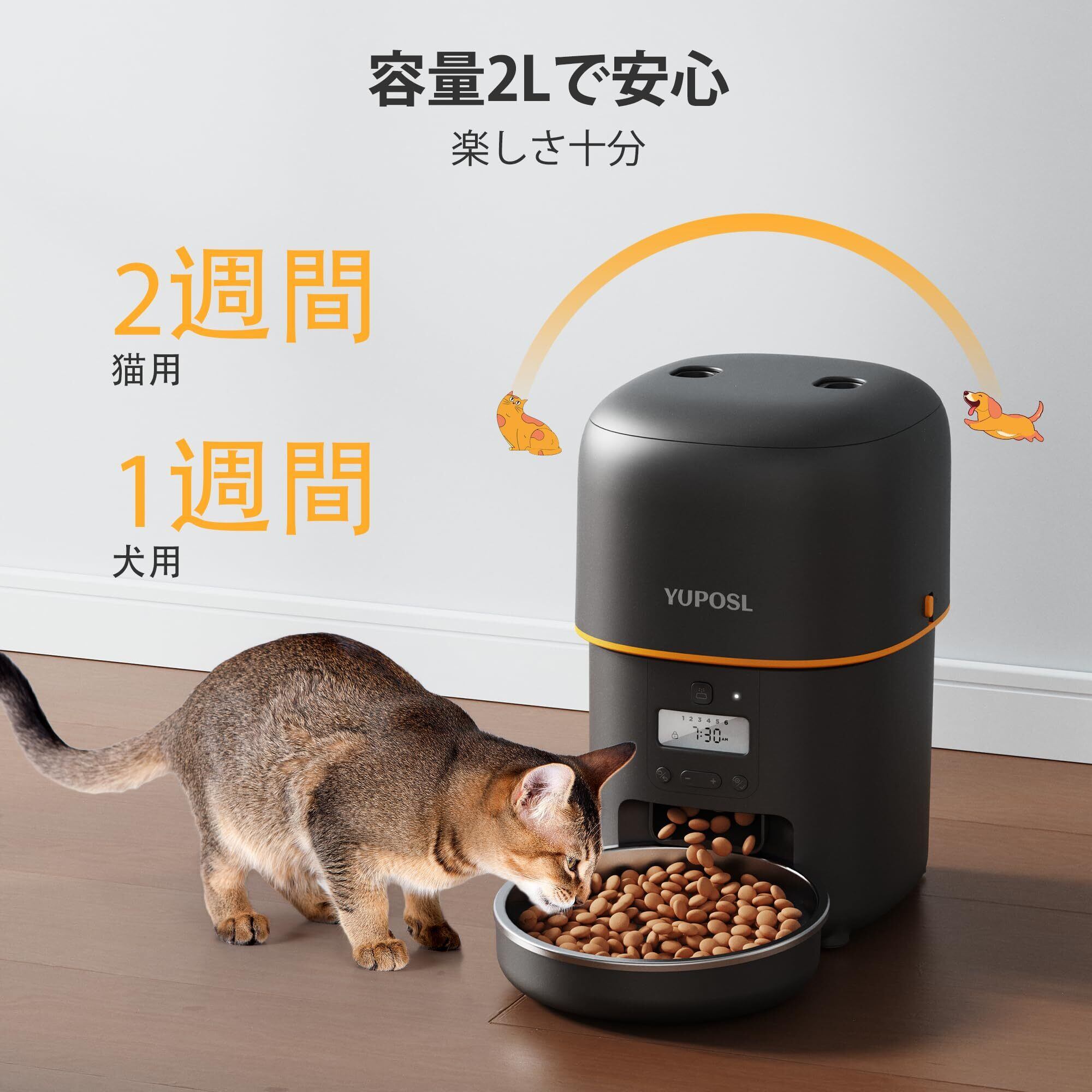 【新春セール】Yuposl 自動給餌器 猫 中小型犬用 1日6食 定時定量 2L容量 自動餌やり機 タイマー式 餌の鮮度保持 2WAY給電 無制限置き場所 水洗い可能 ステンレス製ボウル 手動給餌 設定・お手入れ簡単 ブラック | カウカウ物販