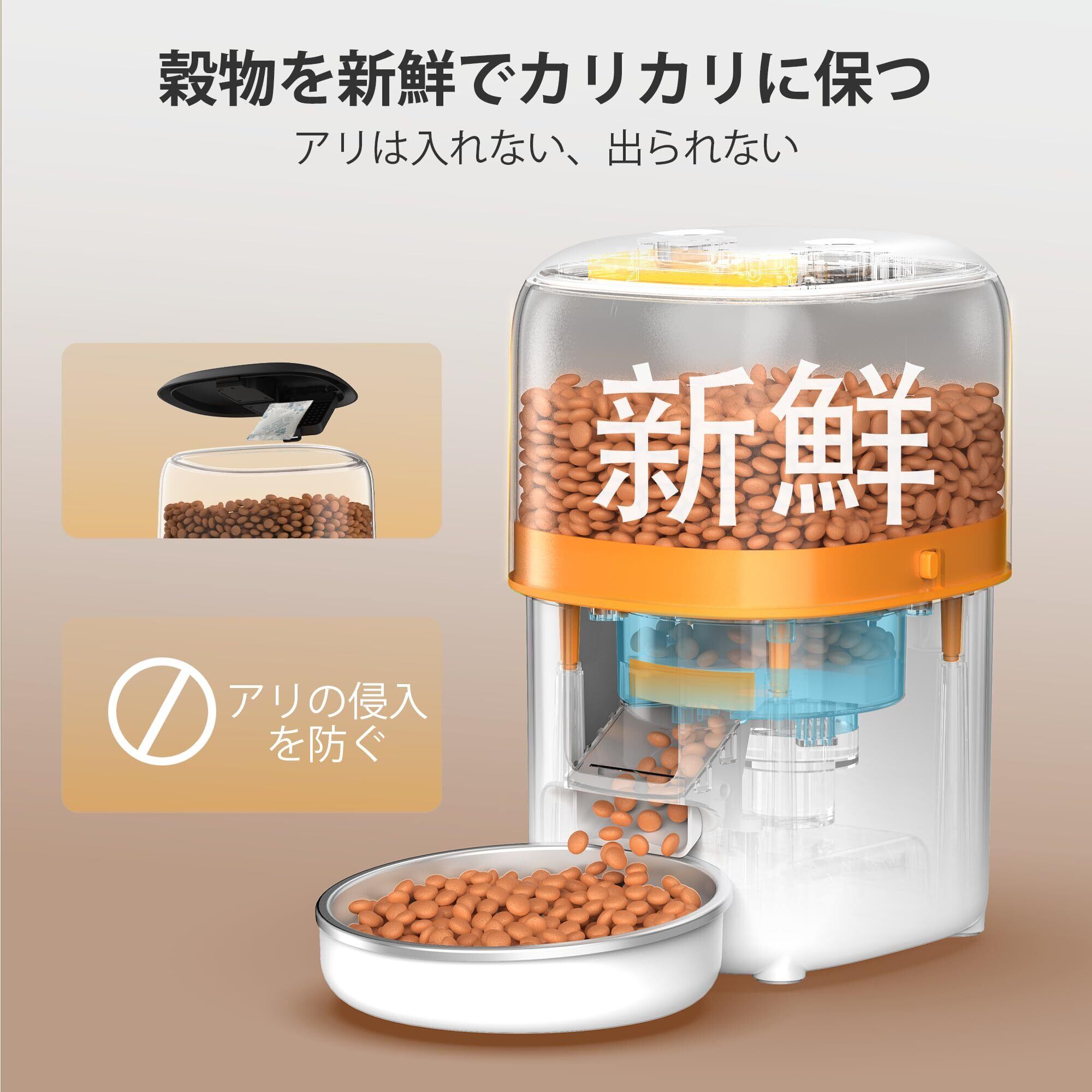 【多重密閉構造でフードはいつも新鮮】猫用自動給餌器の上蓋は、強化シールと乾燥剤を使用して設計され、フードを長時間新鮮に保ちます。さらに、フードバケツの両側には安全ロックキャッチが備えられ、内部ローターが目詰まりを防止し、給餌器内部とフード出口の隙間が完全に密閉されます。これにより、虫の侵入を防ぎ、清潔で新鮮なフードをいつでもペットに提供できます。