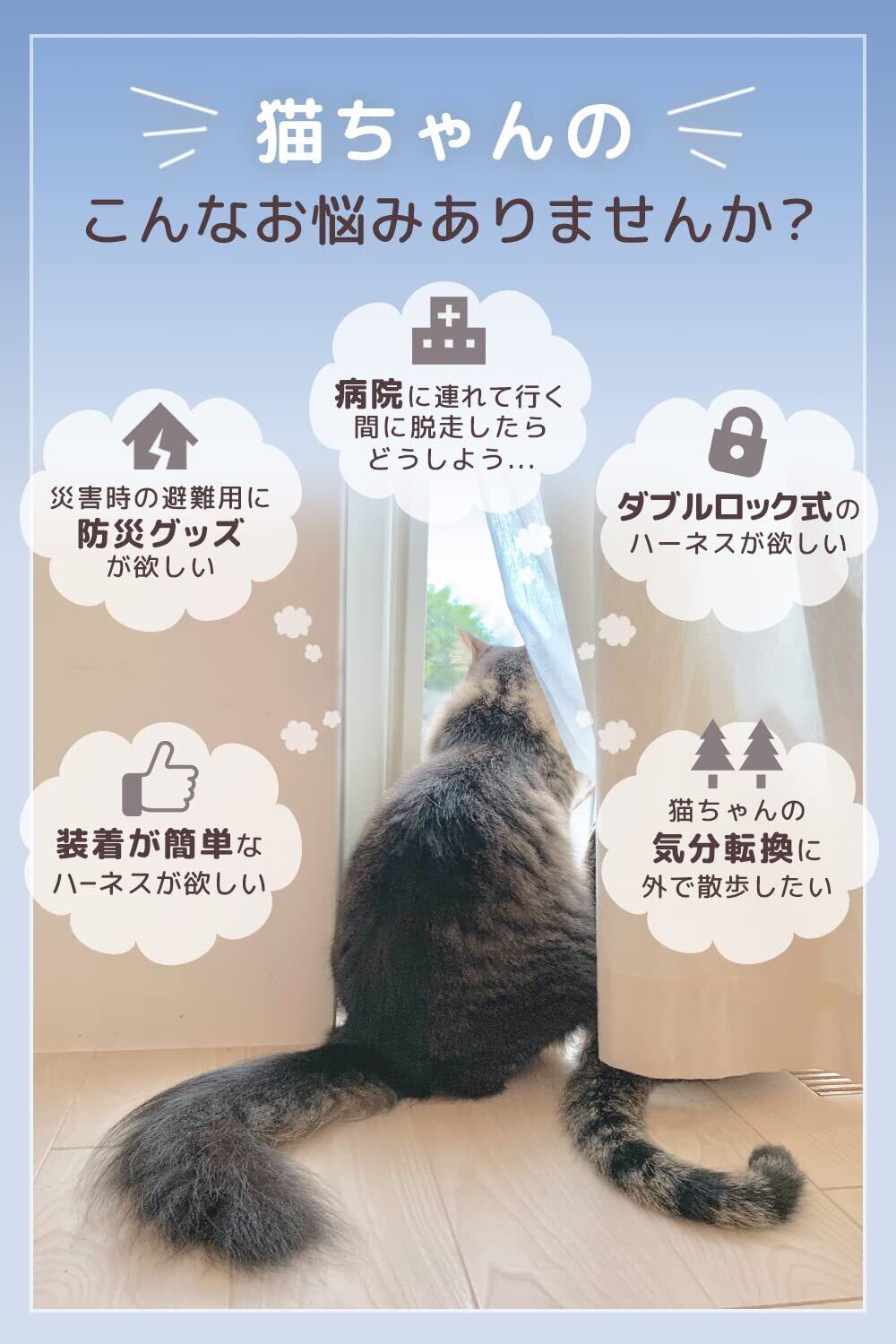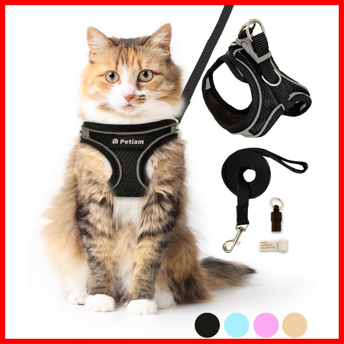 (シリーズ累計2万個突破) Petiam 猫 ハーネス リード 猫用 抜けない ダブルロック リードセット 迷子札付き お散歩セット (ブラック, L)