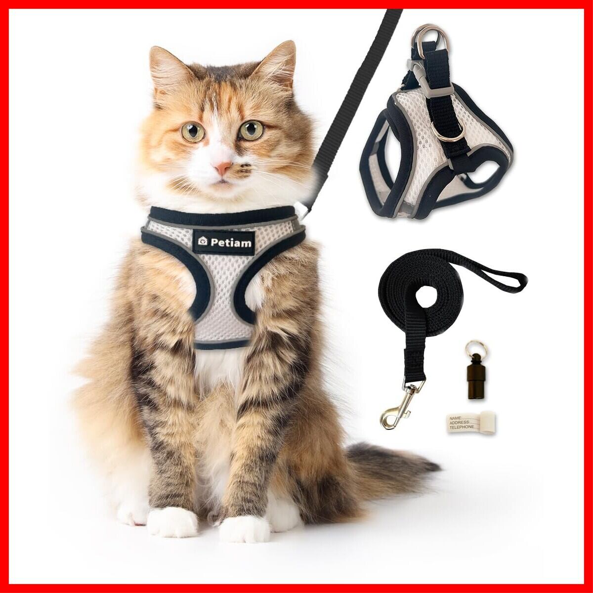 (シリーズ累計2万個突破) Petiam 猫 ハーネス リード 猫用 抜けない ダブルロック リードセット 迷子札付き お散歩セット (ホワイト, M)