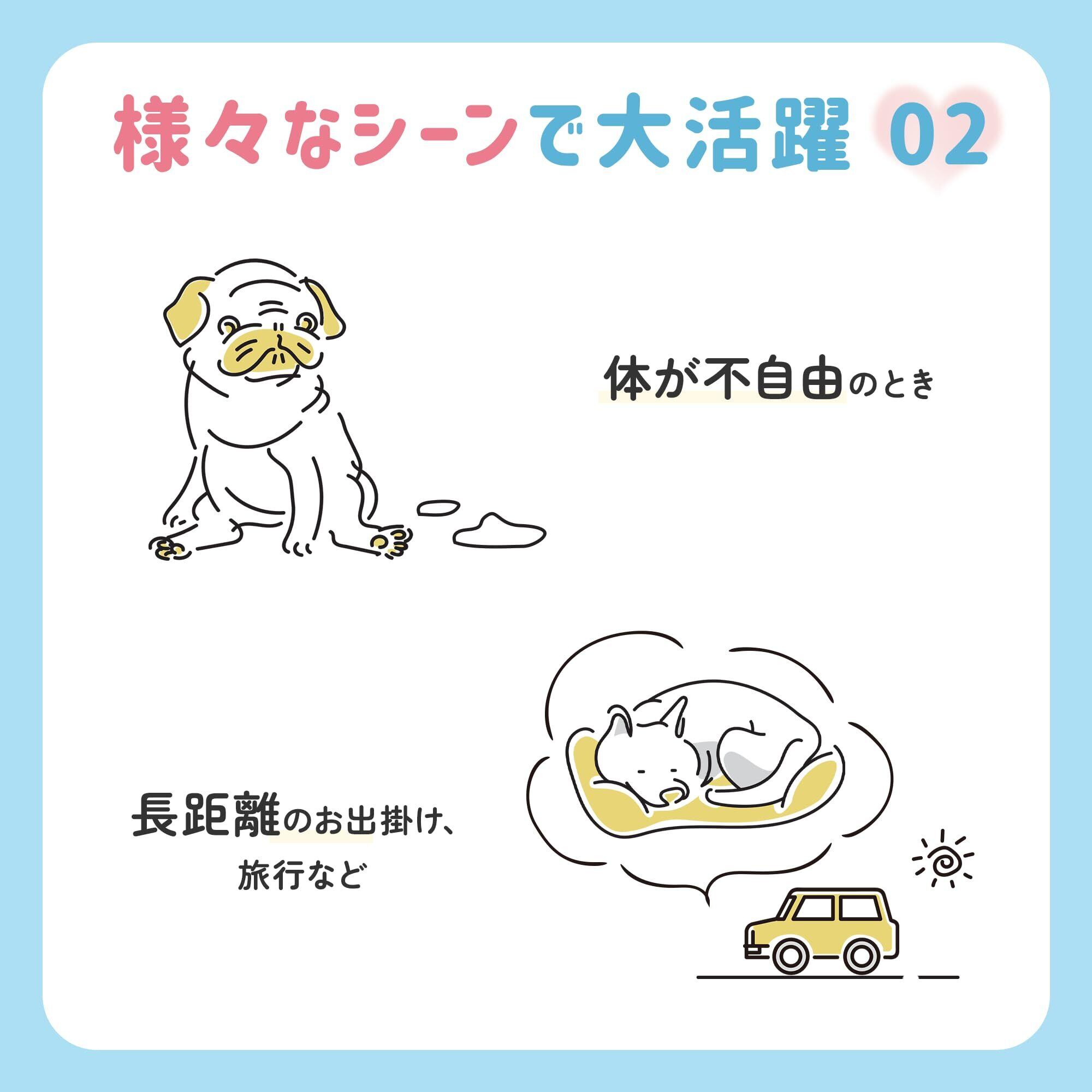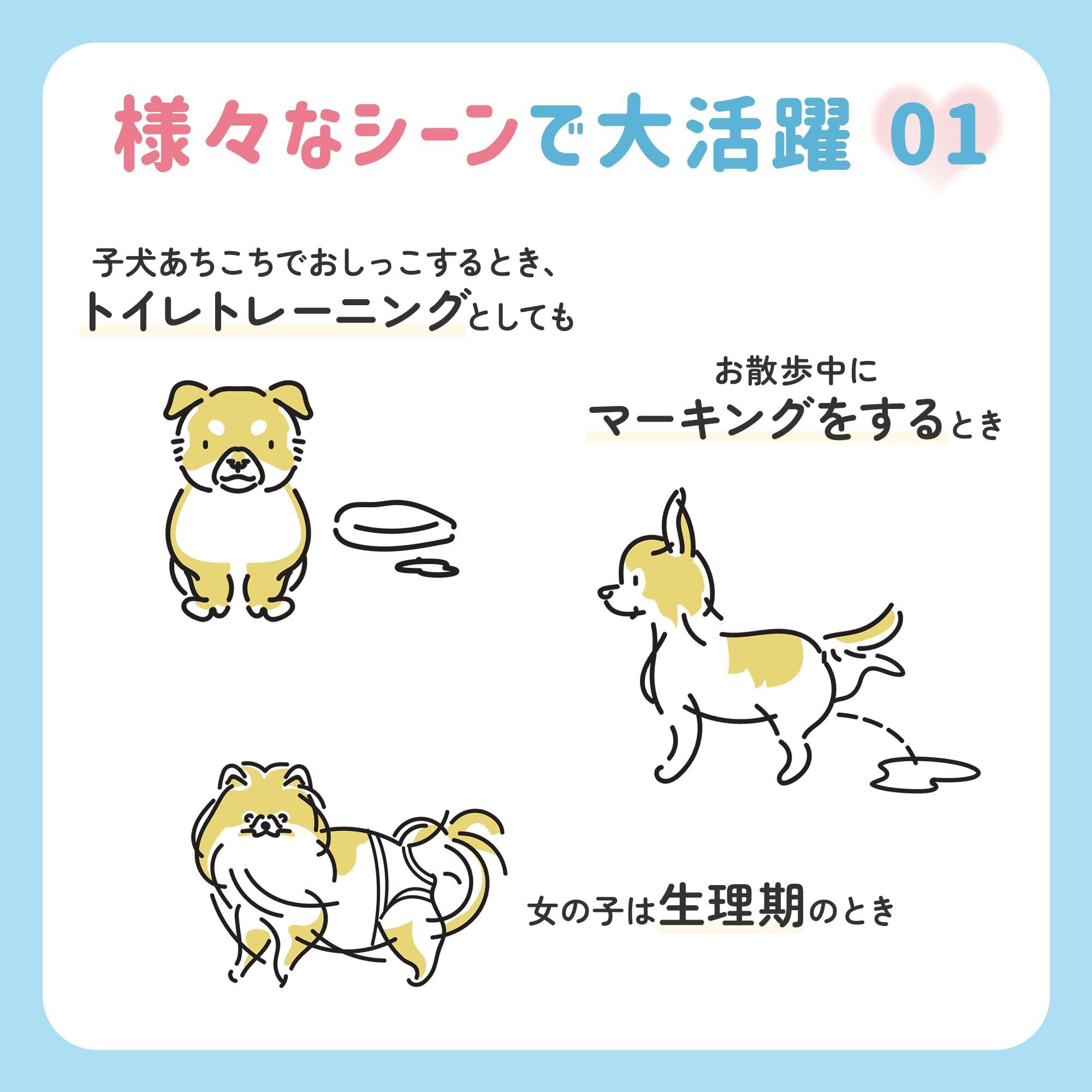 【様々なシーンで大活躍】大切なワンちゃんのおもらしや、マーキング、介護、病中病後、生理に!シニア犬には介護用、パピーにはトイレトレーニングとして。長距離のお出かけやドライブにもお使いいただけます。