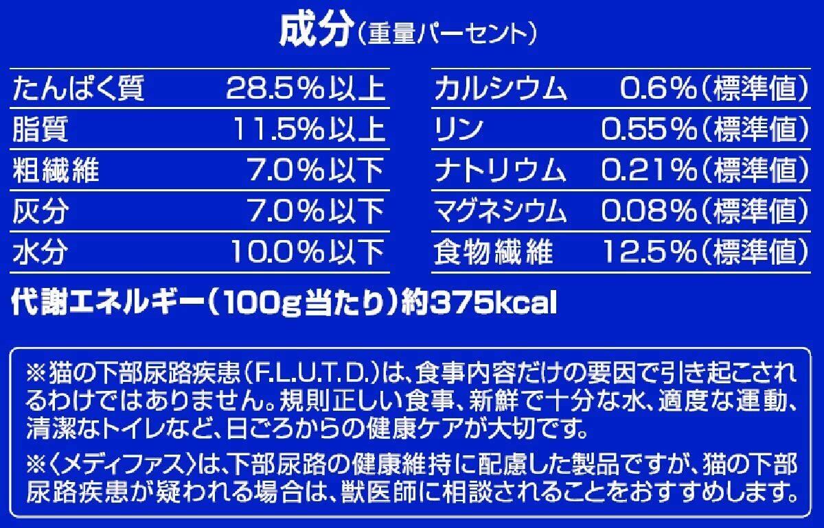 たんぱく質:28.0%以上、脂質:12.0%以上、粗繊維:7.0%以下、灰分:7.0%以下、水分:10.0%以下、カルシウム:0.6%標準値、リン:0.55%標準値、ナトリウム:0.21%標準値、マグネシウム:0.08%標準値、食物繊維:12.5%標準値、代謝エネルギー:約375kcal/100g