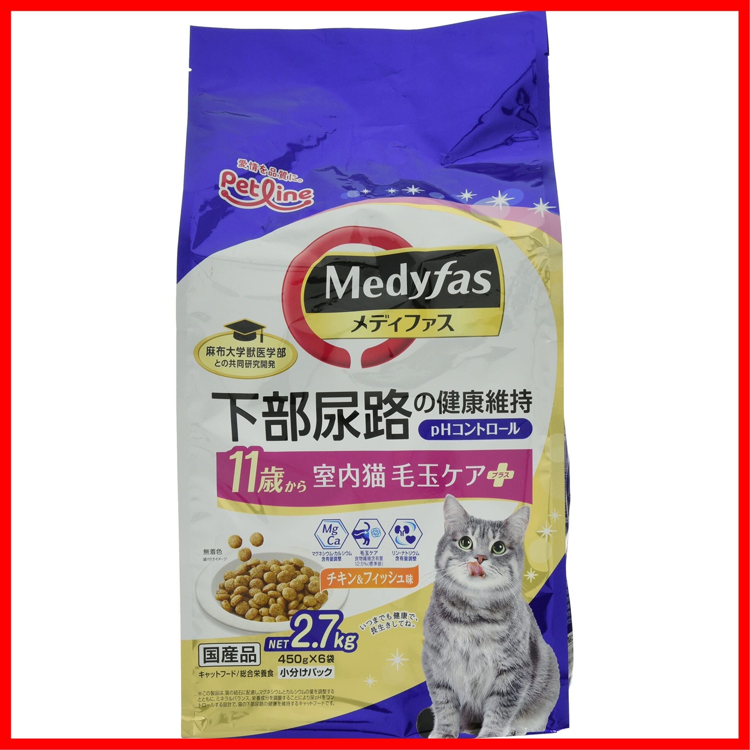 メディファス キャットフード 室内猫毛玉ケアプラス 11歳から チキン&フィッシュ味 【下部尿路/pHコントロール/麻布大学共同開発/国産/アルミ小分け】 2.7kg(450g×6)